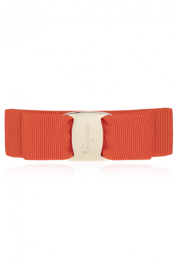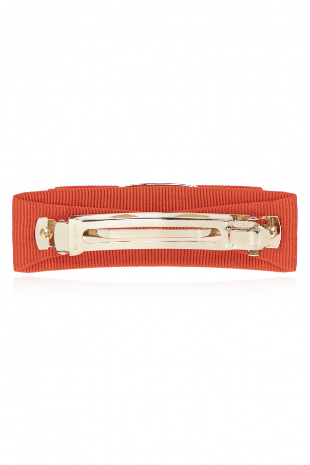 Orange hair clip from Salvatore Ferragamo. This item showcases gold-tone metal hardware and a bow with a logo-embossed application in gold-tone.