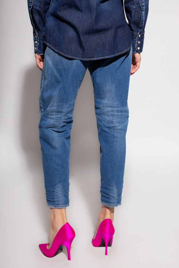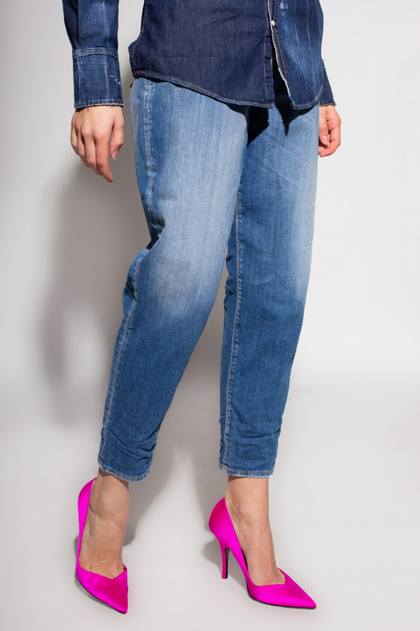 Blue \'Sasoon\' high-waisted jeans Dsquared2. Fastened with a button and a zipper. On the back, there is a patch with the \'1964\' logo embossed in a brown color. Five slip pockets: three on the front and two on the back.