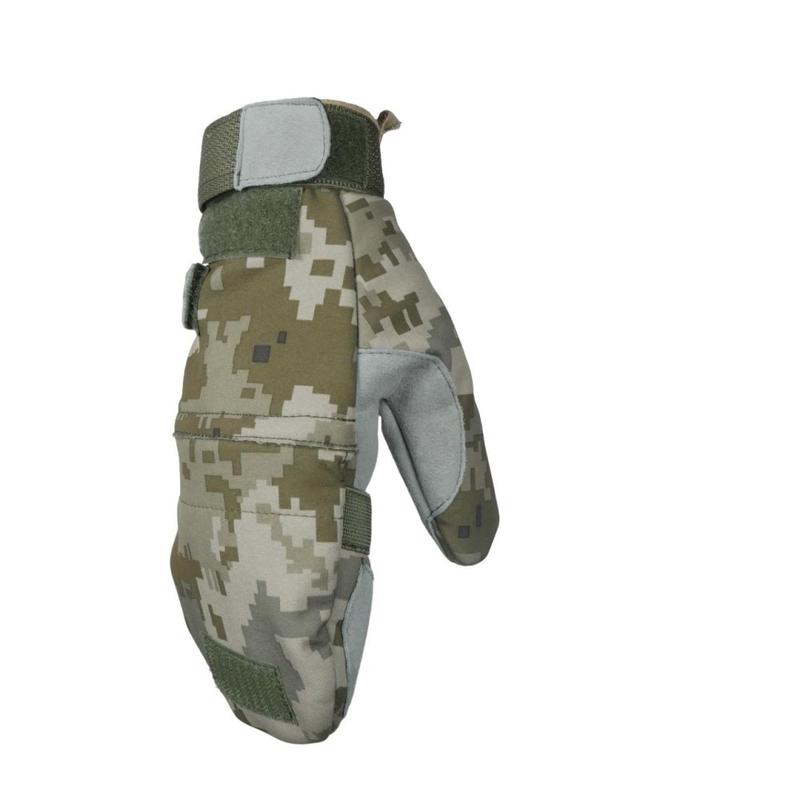 Материал: софтшел 340 (пиксель), натуральная кожа (черные), мягкая и теплосберегающая подкладка флис 280, долонная часть имеет защитное покрытие из натуральной замши.