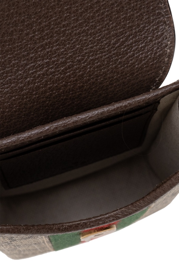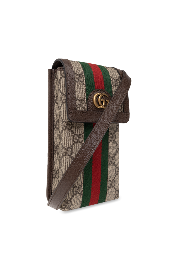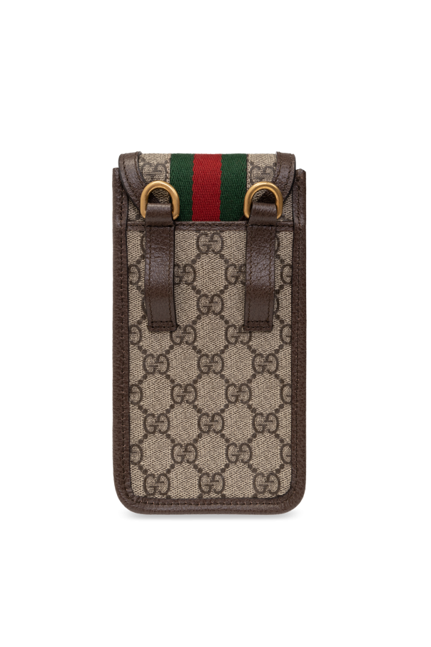 Beige and brown phone holder from Gucci. Crafted from ‘GG Supreme’ canvas and trimmed with calf leather, this design fastens with a snap and showcases a stitched green and red ‘Web’ stripe and ‘Double G’ logo hardware. It is complete with a detachable and adjustable shoulder strap, antiqued gold-tone metal elements and one internal compartment with two card slots.