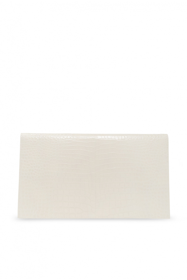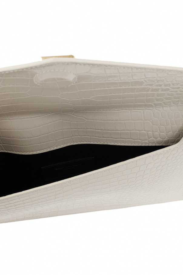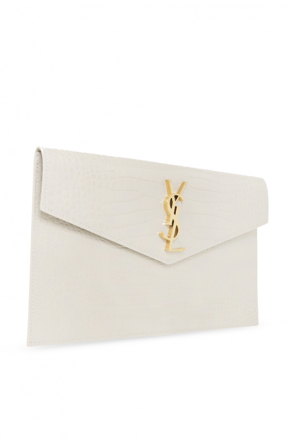 Cream ‘Uptown Small’ clutch from Saint Laurent. Made of calf leather with a crocodile skin effect, this model features a magnetic snap, metal logo appliqué in gold-tone and one internal compartment.
