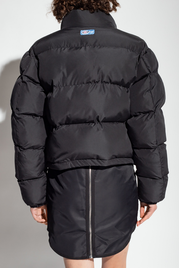 Black jacket with a standing collar from Heron Preston. Crafted from 100% recycled polyester, this style features a cropped fit, a zip fastening, a drawcord-adjustable hem, polyester padding and long sleeves – one has an orange logo patch.