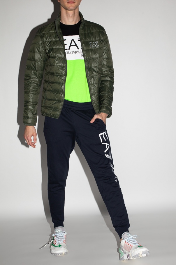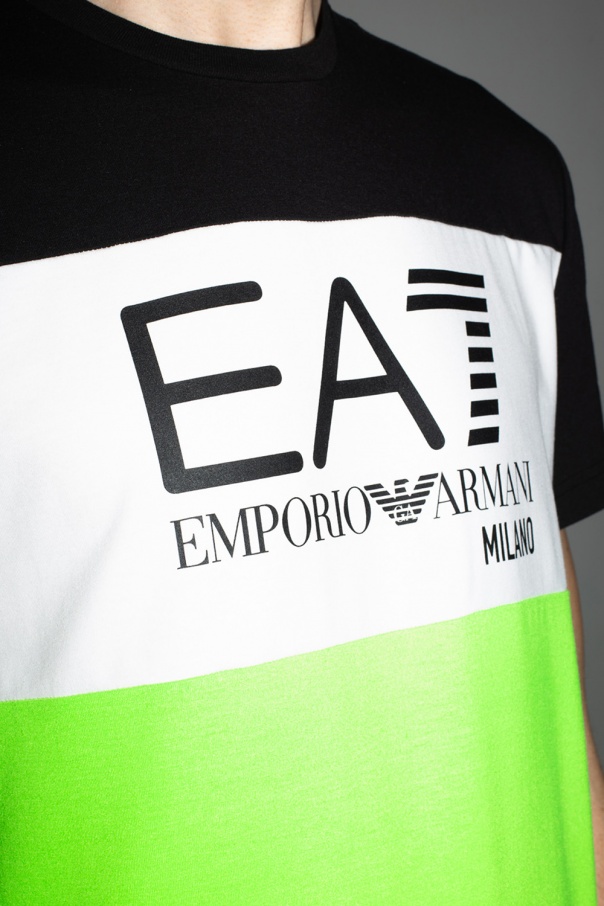 Black, white and green T-shirt from EA7 Emporio Armani. This design features a ribbed round neck and a printed logo pattern in black.