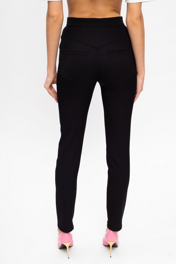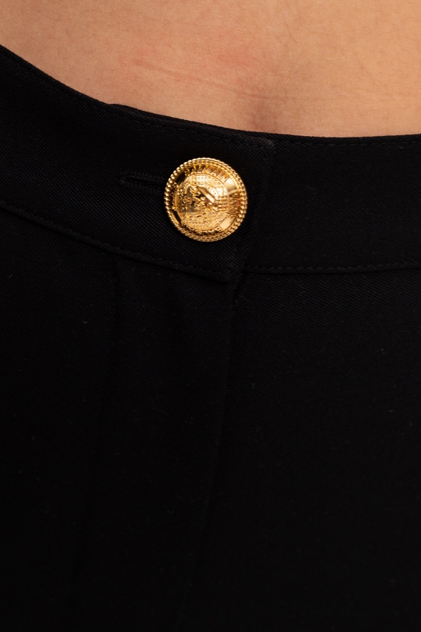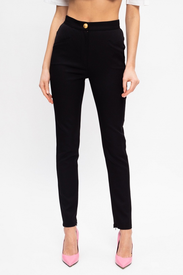 Black high-waisted trousers from Balmain. Made of wool, this tapered leg design features a zip and metal logo button in gold-tone as well as two front pockets, two back pockets and zips at the cuffs.