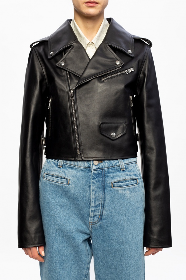 Black biker jacker from Loewe. Crafted from calf leather with a cropped, slim-fit silhouette, this style fastens via a zip and showcases three zipped pockets and one snap-fastened flapped pocket on the front, zipped vents to the cuffs and a red lining.