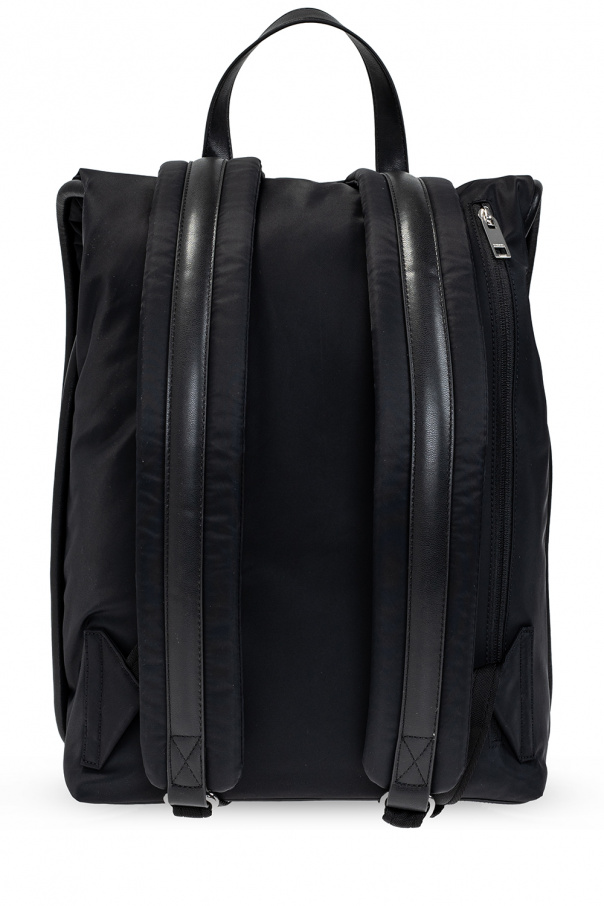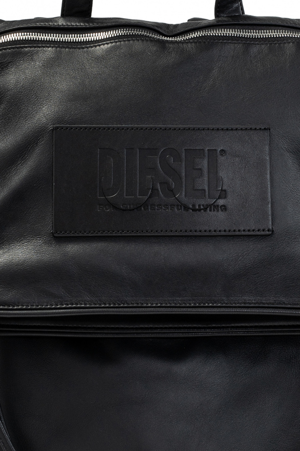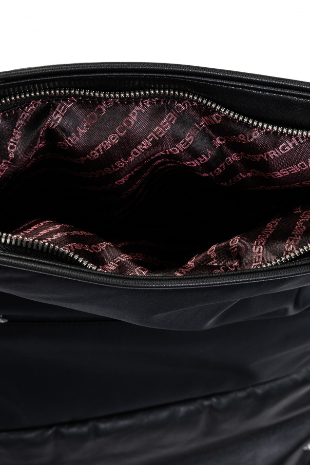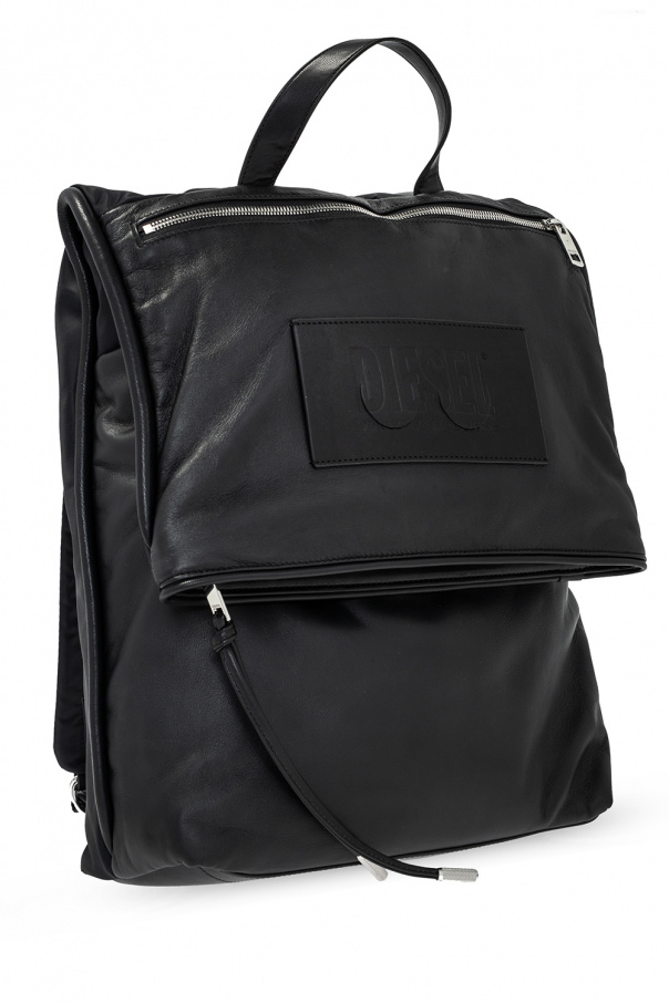 Black ‘Juliet’ backpack from Diesel. Crafted from leather and fabric, this design secures with a zip and snaps and showcases an embossed logo on the front, a zip pocket on the back, a half-round handle, adjustable shoulder straps, silver-tone metal hardware and one internal compartment.