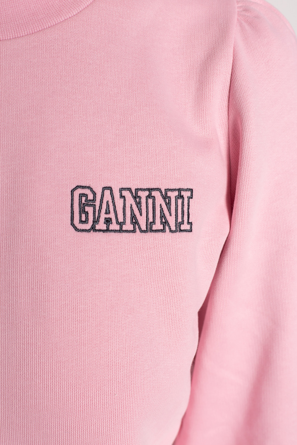 Light pink sweatshirt from Ganni. Crafted from organic cotton, this garment features a dark grey logo embroidery and ribbed trims at the crew neck, hem and puff sleeves.