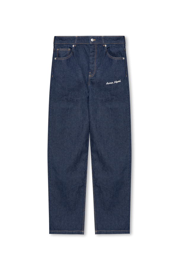 Navy jeans from Maison Kitsune. Fastened with buttons, this pair features a white logo embroidery, three front pockets, two back pockets and slightly tapered legs.