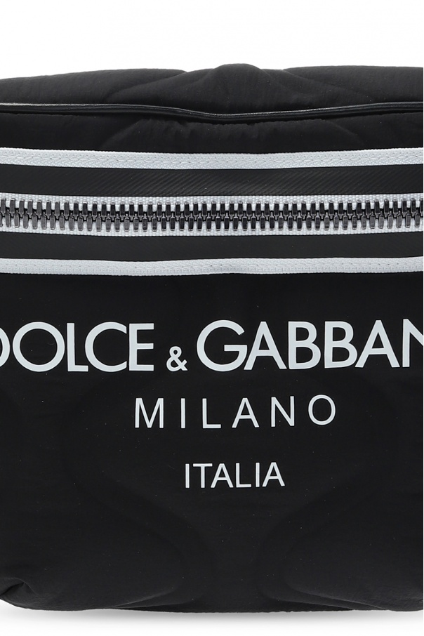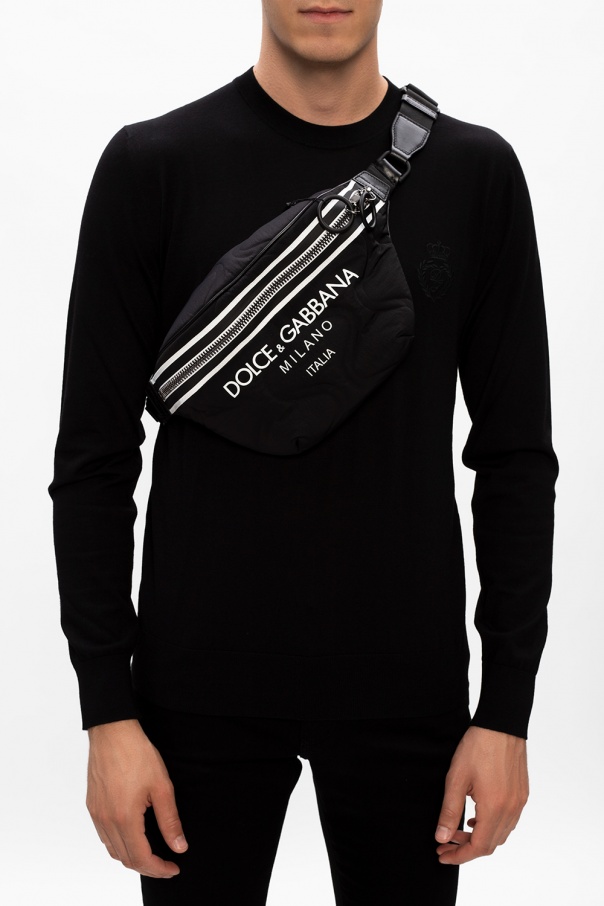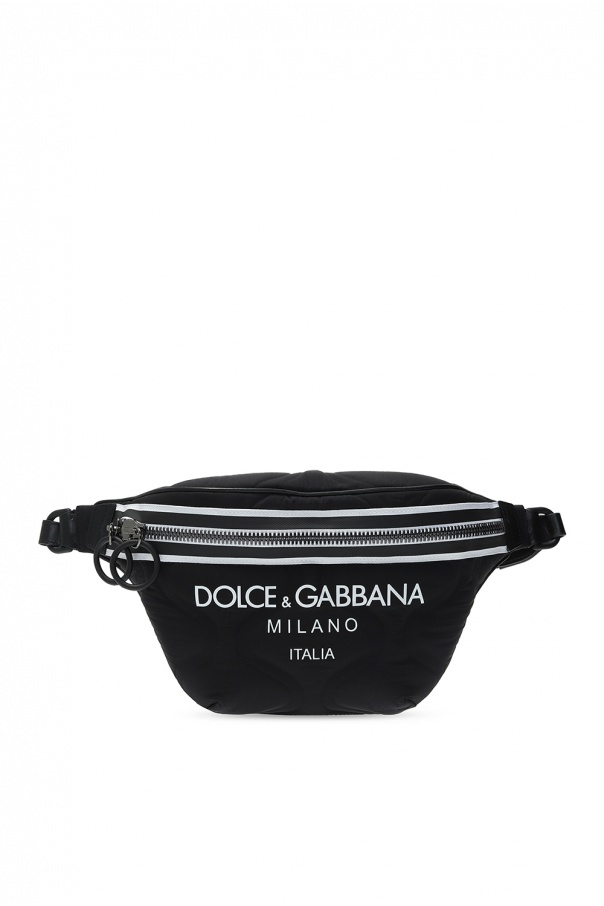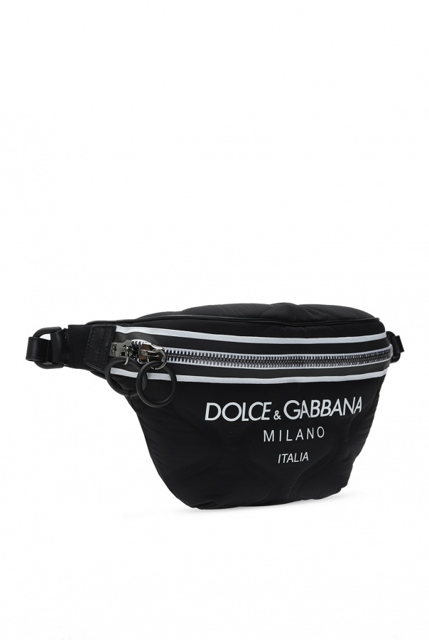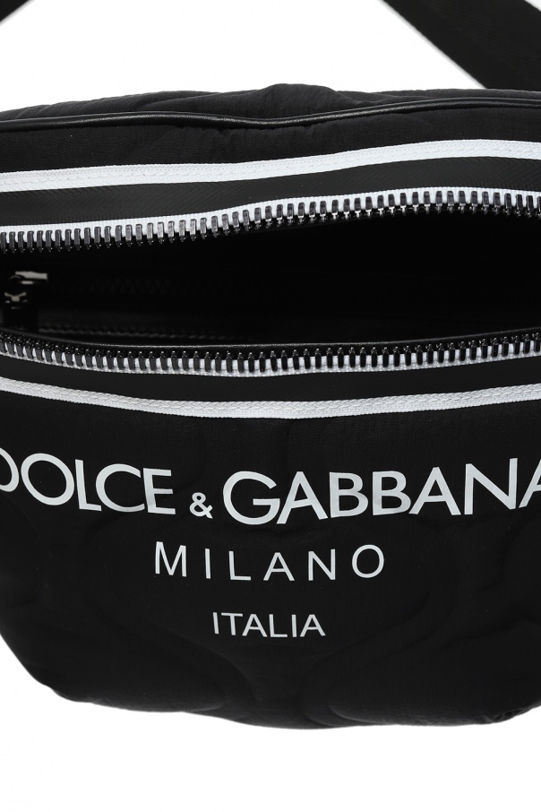 Black and white belt bag from Dolce & Gabbana. Printed with the label's logo in white, this design fastens via two-way zip closure and employs three external card slots on the back, a detachable and adjustable strap, black and grey metal hardware and and interior with one compartment and one zip pocket.