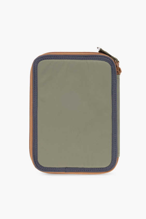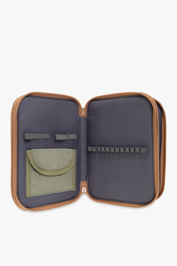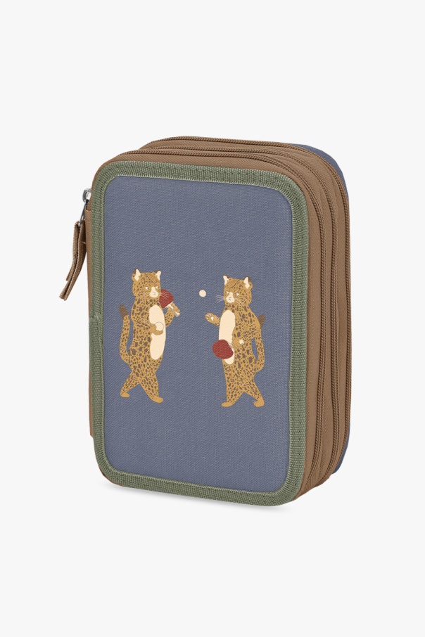 Blue, green and brown pencil case from Konges Slojd. Crafted from recycled material, this item has three separate zipped compartments. The front presents a colourful animal print. It is complete with a variety of fixtures to hold all the necessary stationary tools in place, a mirror and a flapped pocket with a snap inside.
