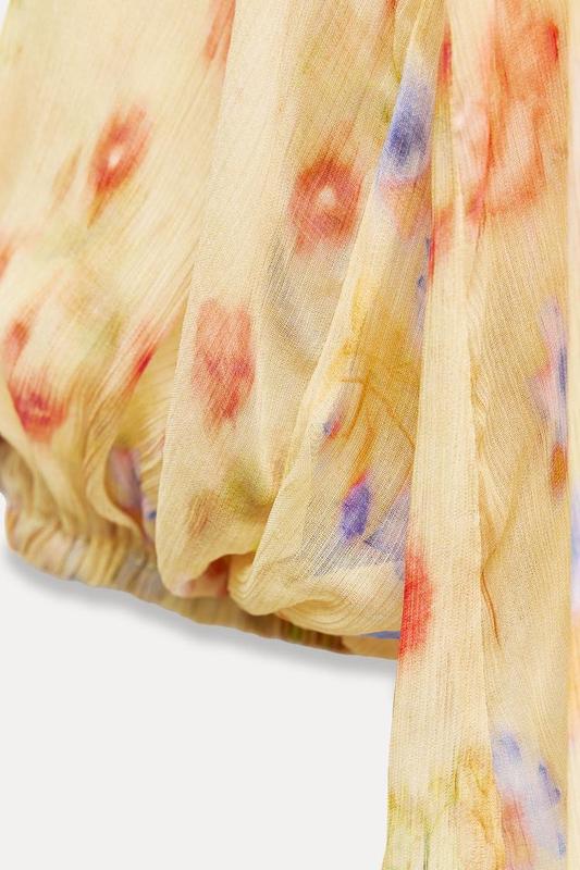 Блузка из 100% пряденой вискозы. С воротником-шлицем, длинными объемными рукавами с эластичными манжетами, асимметричным низом и застежкой спереди.