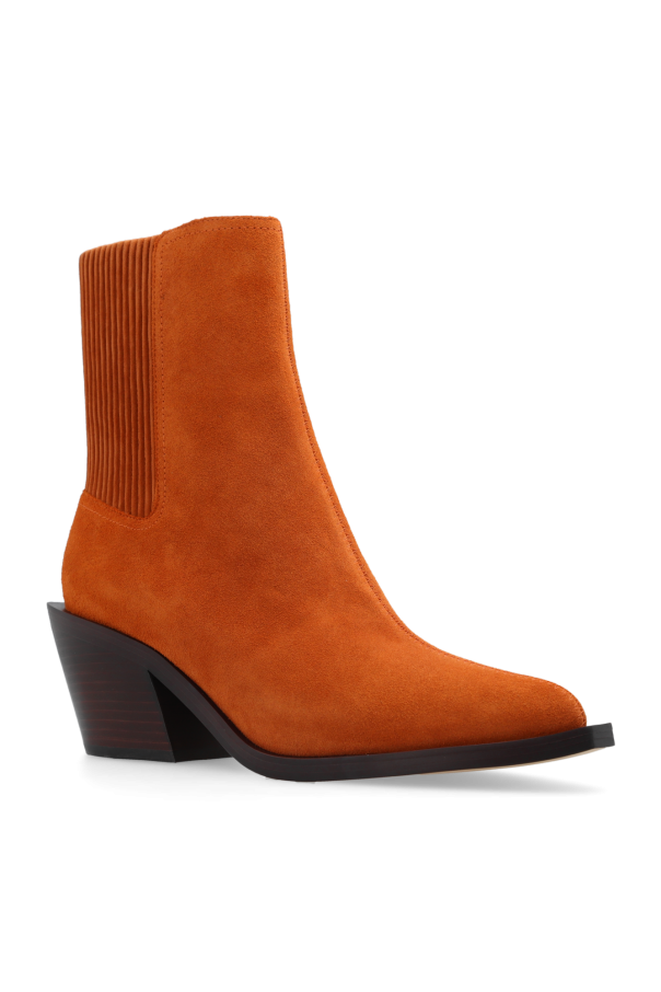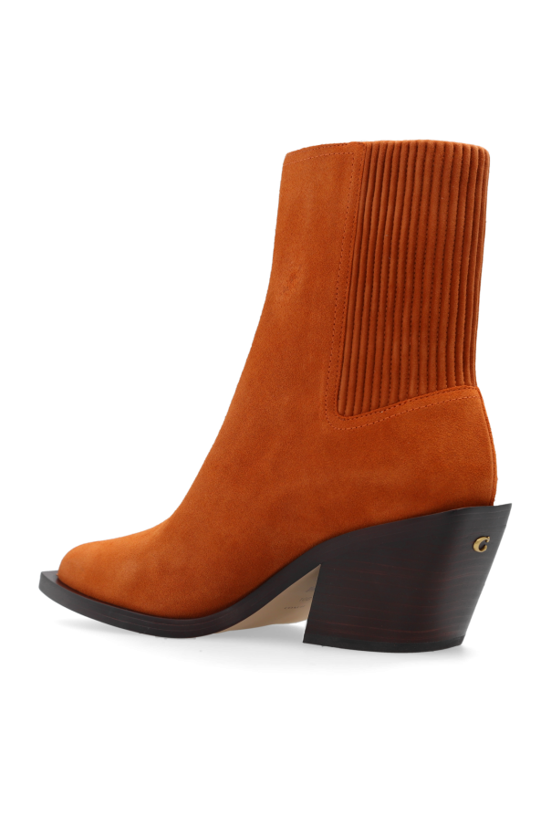 Brown ‘Prestyn’ heeled ankle boots from Coach. Made of suede, this pair sits on a light beige rubber sole and features a pointed toe, stitching at the back and a dark brown heel with a gold-tone logo detail.