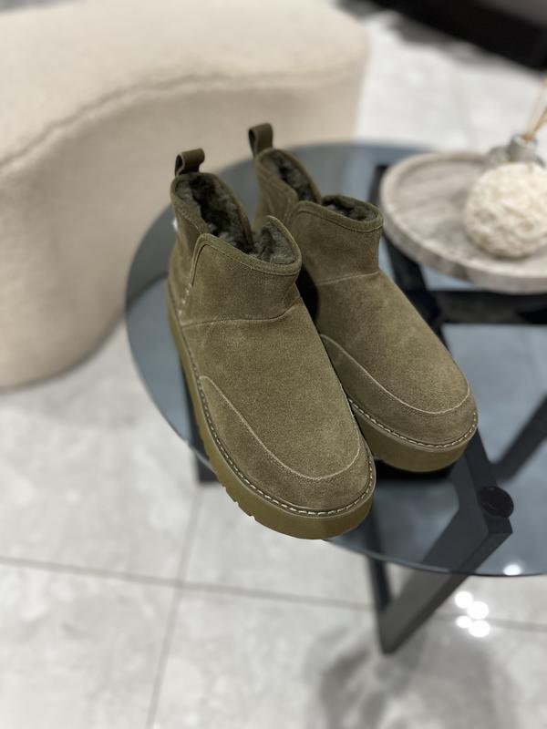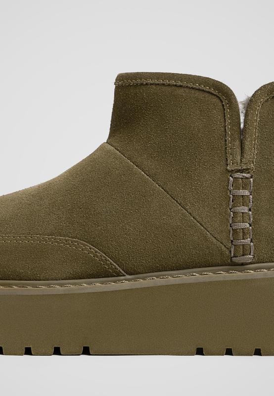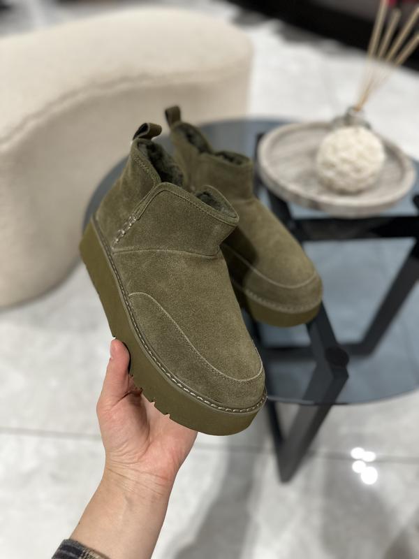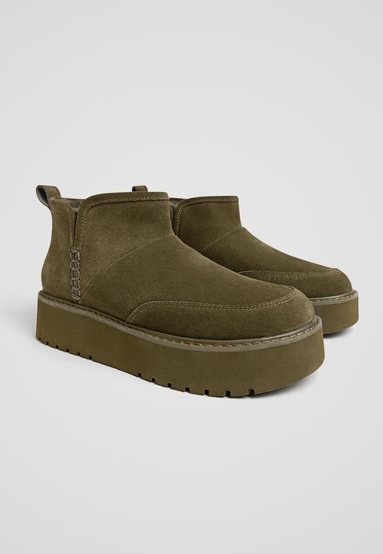 Плоские угги из натуральной замши. Подкладка из искусственного меха и прошитые детали по бокам. Доступен в нескольких цветах. Высота подошвы: 4 см. Размеры хаки 38(24,6)39(25,3)