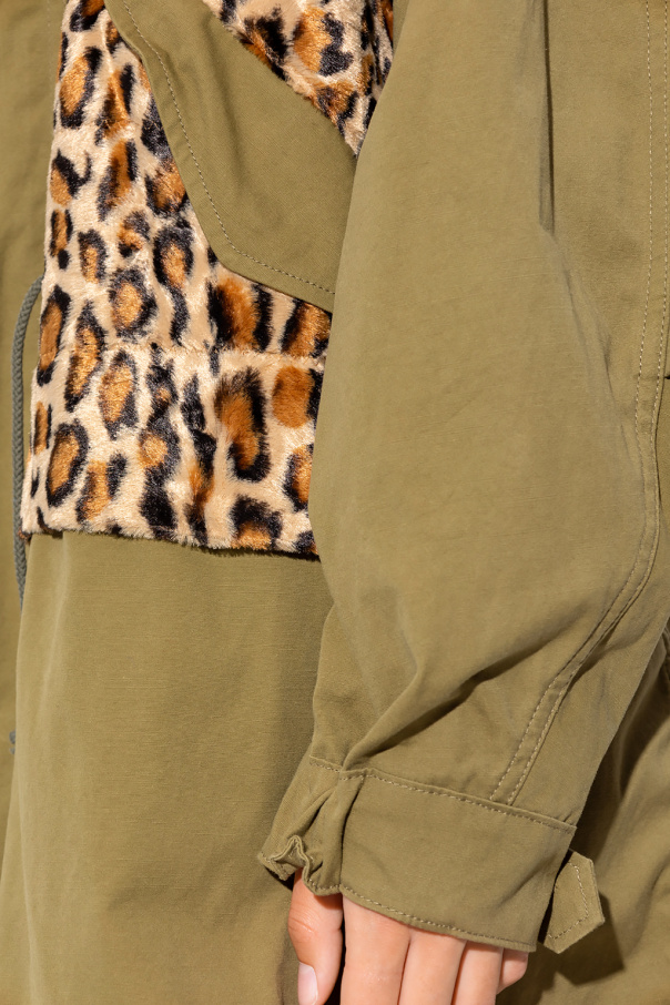 Khaki parka with a standing collar from Junya Watanabe Comme des Garcons. Crafted from cotton with an oversize silhouette, this style showcases a beige and brown insert with an animal motif, a zipper accompanied by snap closures, a drawcord-adjustable waist and hem, two snap-fastened flapped pockets, long sleeves and a single back vent.