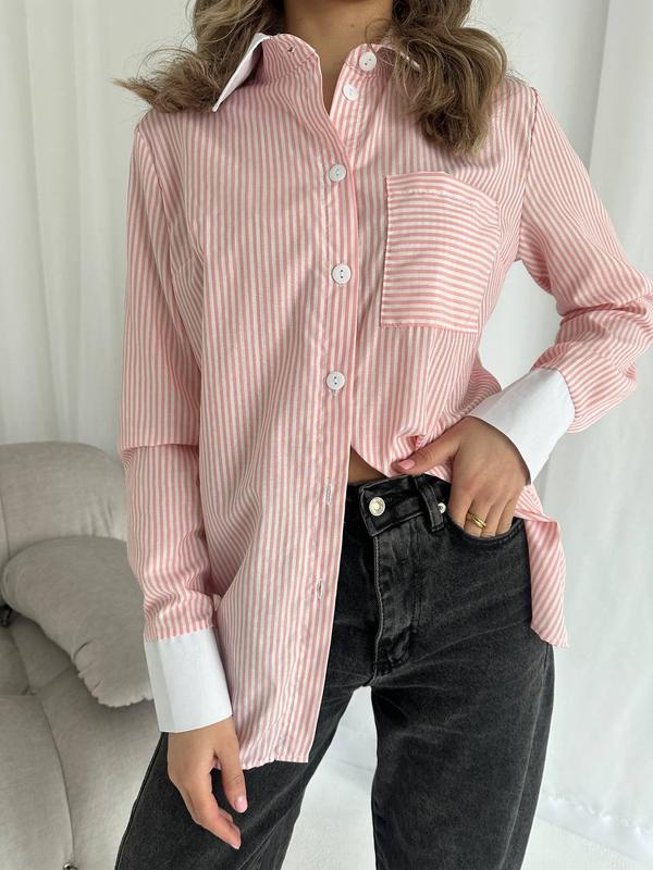 Фото — реалСорочка у стилі ZARA . Легкий оверсайз з класичним коміром ,з класичною лінією плеча та довгими рукавами . Складки на манжетах та защип ззаду . Комір та манжети білого кольору надають цікавинки виробу . Накладна кишеня із смужкою в іншому напрямку виглядає дуже симпатично .