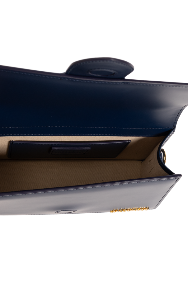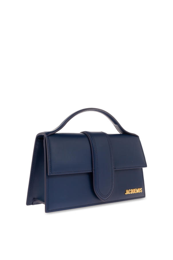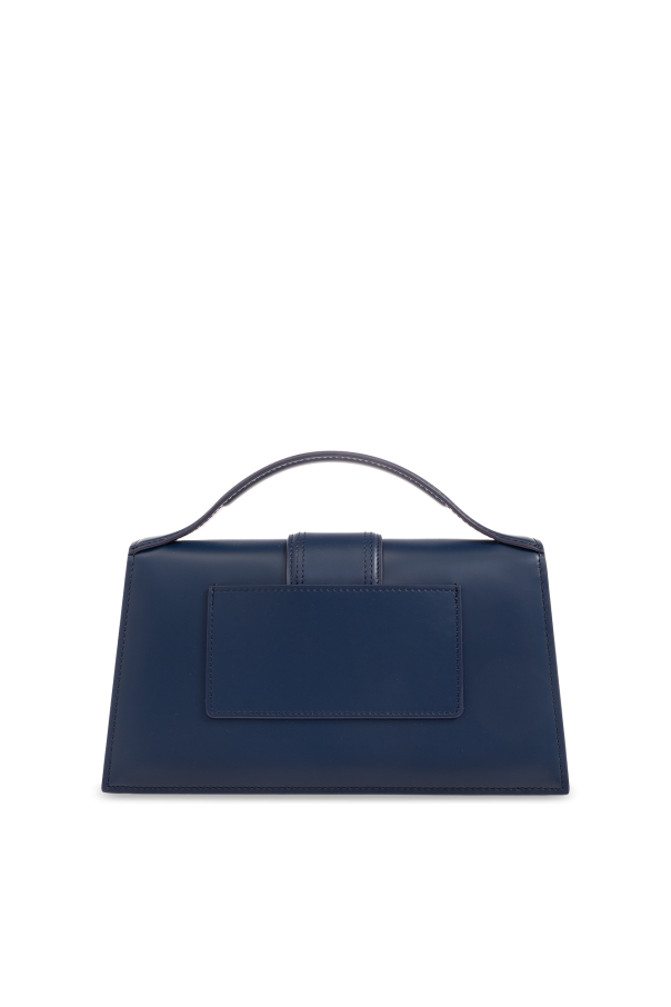 Navy ‘Le Grand Bambino’ shoulder bag from Jacquemus. Crafted from calf leather, this design features a magnetic snap closure, metal logo detail, back pocket, short handle, detachable and adjustable shoulder strap, gold-tone metal hardware and one internal compartment with one card slot.