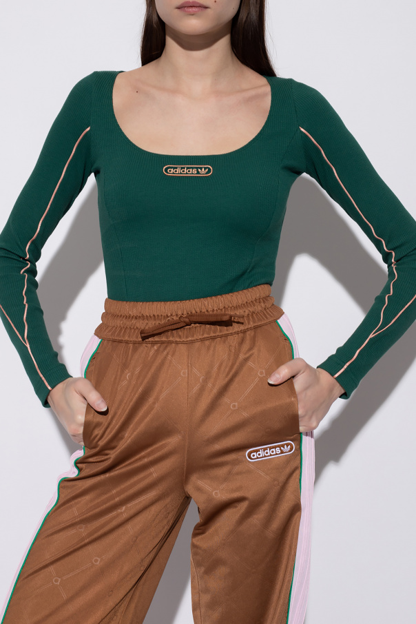 Dark green body from ADIDAS Originals. Fastened with snaps, this long sleeve design is decorated with a logo patch and light pink side stripes.