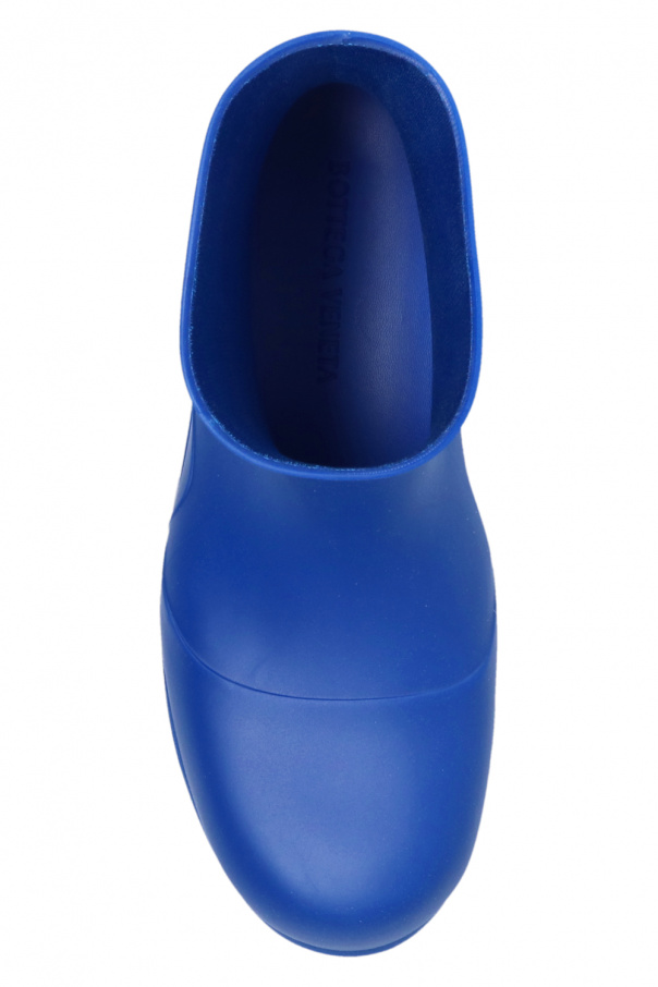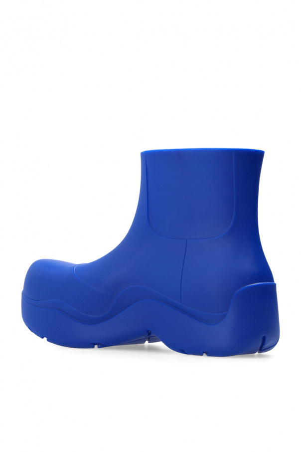 Short navy ‘Puddle’ rain boots from Bottega Veneta. Made of biodegradable materials, this seamless pair features a cotton lining and a navy rubber sole.