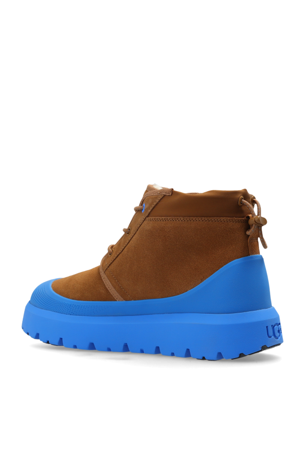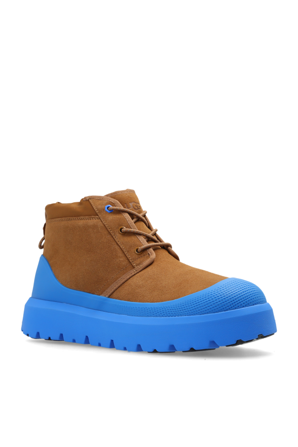 Introducing the exquisite Neumel Weather Hybrid men\'s snow boots from the esteemed UGG collection. Crafted in a striking combination of brown and blue, these boots are an epitome of style and functionality. The upper is meticulously fashioned from premium brown suede, offering an elegant yet rugged aesthetic. The thick rubber sole, in a vibrant blue hue, ensures exceptional grip and insulation against the cold, with reinforced sections at the heel and toe for enhanced durability and moisture resistance. Designed for optimal comfort, the boots feature classic lacing for a tailored fit, and the interior is lined with a plush blend of synthetic fur, providing unparalleled warmth and coziness. The medium-height collar extends above the ankle, delivering superior protection from the elements. The iconic \"UGG\" branding adorns the upper, a testament to the brand\'s heritage and commitment to quality. Originating from the plains of Australia and embraced by surfers in Southern California, UGG continues to uphold its tradition of craftsmanship with every pair. Why Choose This Product? Elegant brown suede upper with striking blue accents Thick rubber sole for excellent grip and insulation Reinforced heel and toe for durability Warm, plush interior lining Classic lacing for a customized fit Iconic \"UGG\" branding Ideal for challenging winter conditions