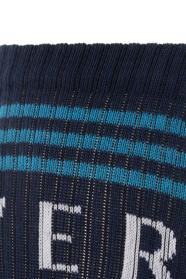 Navy blue, blue and white socks from Versace. Made of cotton, this pair is embellished with a logo pattern and features ribbed cuffs.