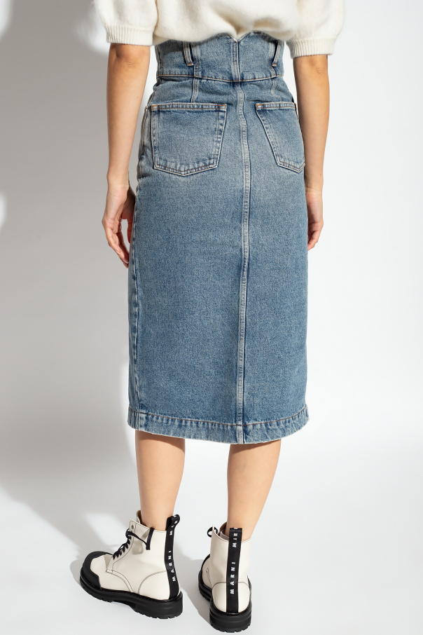 Blue denim skirt from Iro. Made of cotton with distressed effects, this pair features a zip fly, classic five-jean pockets and a frontal slit for walking ease.