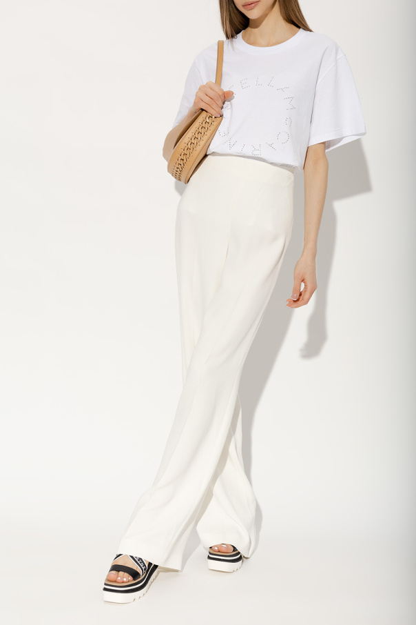 Black and white ‘Sneak-Elyse’ wedge sandals from Stella McCartney. Crafted in part from recycled materials and trimmed with faux leather, this model sits on a beige, black and white rubber sole and showcases crisscross straps with a stripe motif and logo.