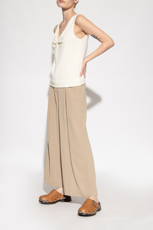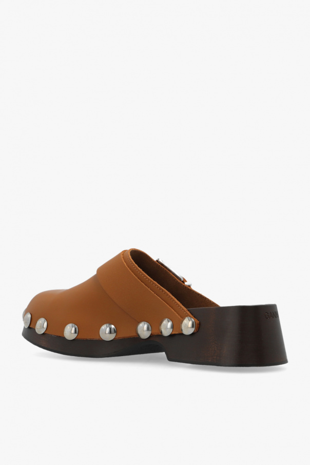 Light brown clogs from Ganni. Made of calf leather, this pair is complete with a decorative buckle strap, silver-tone studs and brown wood sole with black rubber trims.
