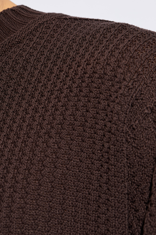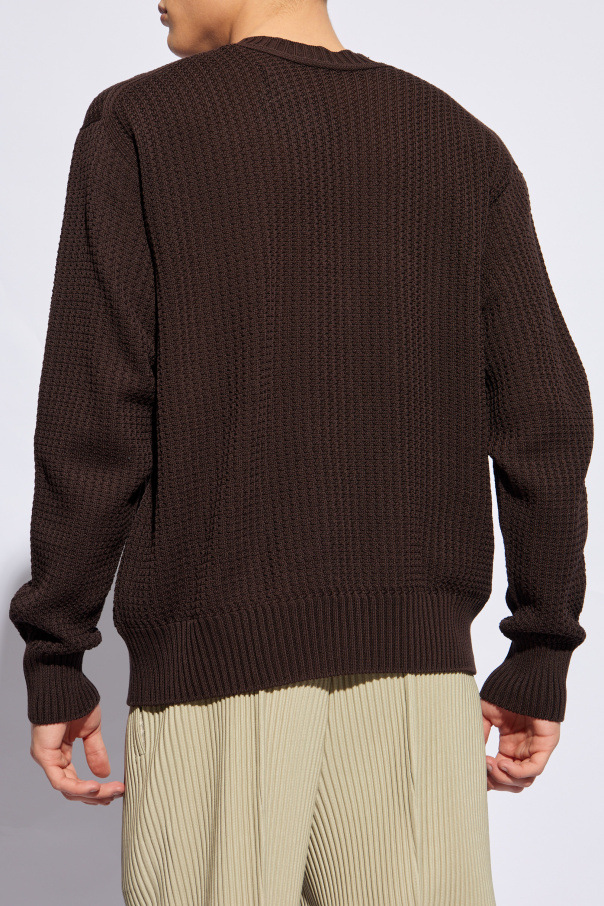 Introducing the quintessence of sophistication and warmth, the Issey Miyake Homme Plissé Cotton Sweater in a rich, dark brown hue. Crafted from premium 100% cotton, this pullover sweater embodies the pinnacle of minimalist design and exceptional craftsmanship. Its seamless, unbuttoned structure and smooth texture, achieved through a fine knit, exude an air of understated elegance. The garment features a high, round collar, adding a touch of grace while ensuring warmth. The classic cut, with its straight lines and fitted silhouette, flatters the body, accentuating its form. Long sleeves and a hem finished with ribbed cuffs ensure a snug fit that protects against the chill. Notably, the sweater\'s design is devoid of any visible branding, highlighting the designer\'s commitment to timeless aesthetics over transient trends. Styled with light trousers and sandals, as showcased in the accompanying photographs, this sweater transcends casual attire, suggesting a sophisticated yet effortless style. The absence of overt logos or embellishments amplifies its exclusivity, making it a staple for those who value subtlety and quality. Why Purchase This Product? Exemplary 100% cotton composition ensures breathability and comfort. Elegant high, round collar design enhances both style and warmth. Classic, fitted silhouette for a flattering and timeless look. Minimalist aesthetic by Issey Miyake Homme Plissé, perfect for refined tastes. Designed to complement various styles, from casual to sophisticated.