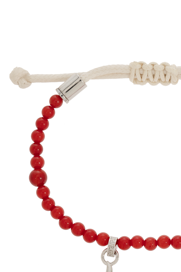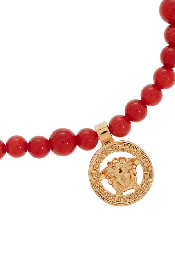 Introducing a masterpiece of exquisite craftsmanship and design, the Versace Red Beaded Charm Bracelet, a radiant addition to any ensemble. This bracelet, a harmonious blend of vibrant red and lustrous gold, epitomizes luxury and versatility. Crafted with meticulous attention to detail, it features an array of delicate, round beads in a rich crimson hue, complemented by golden charms that shine with a timeless elegance. The bracelet boasts a sophisticated adjustable closure mechanism, ensuring a perfect fit for any wrist size. Among its golden charms, a classic Greek medallion stands out, showcasing a profiled visage that may represent the designer\'s symbol or logo, encircled by an intricate, decorative pattern. Another charm, in the shape of a star, adds a touch of whimsy and charm to the piece. The precision and care in the detailing of the medallion charm are evident in close-up photos, highlighting the piece as an integral part of an exclusive collection. The versatility of this bracelet is showcased through its styling in photographs, where it effortlessly complements both a crisp, white long-sleeved shirt and casual attire. This adaptability makes the bracelet a splendid choice for elevating everyday looks or adding a sophisticated touch to special occasions. Why Choose This Product? Exclusive Design: A unique piece from the renowned designer Versace, featuring luxurious red and gold tones. Versatility: Suitable for both elegant and casual wear, enhancing any outfit with its radiant charm. Adjustable Fit: Designed to comfortably fit any wrist size with its adjustable closure mechanism. Exceptional Craftsmanship: The attention to detail in the charms\' design signifies the high-quality standards of Versace\'s exclusive collections.