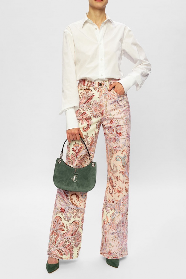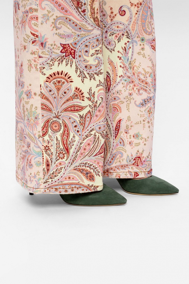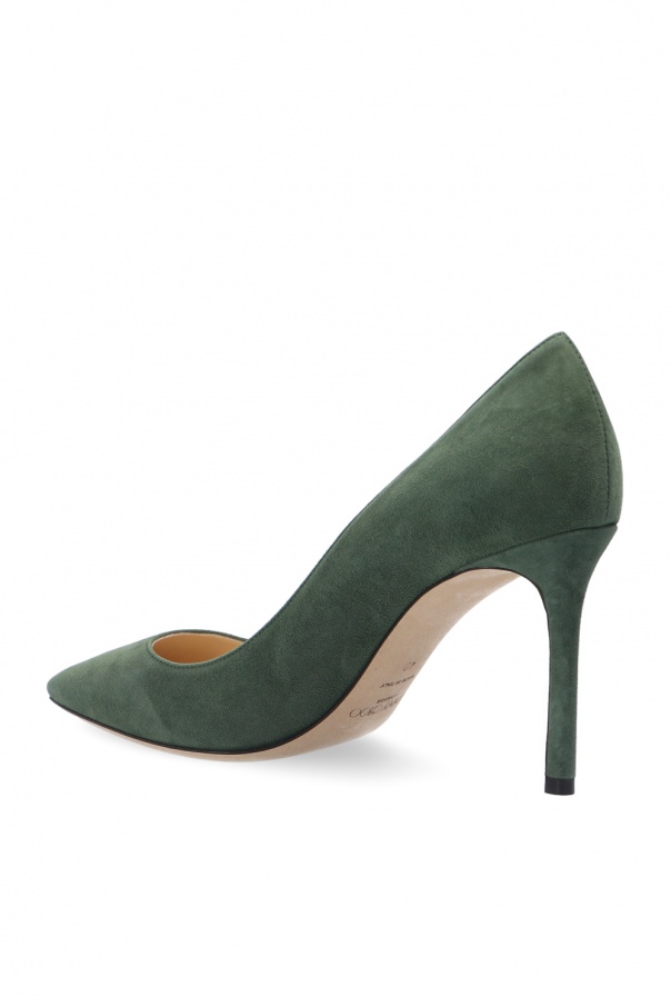 Green \'Romy 85\' stiletto pumps from Jimmy Choo. Crafted from suede, this model is set on a cream leather sole.