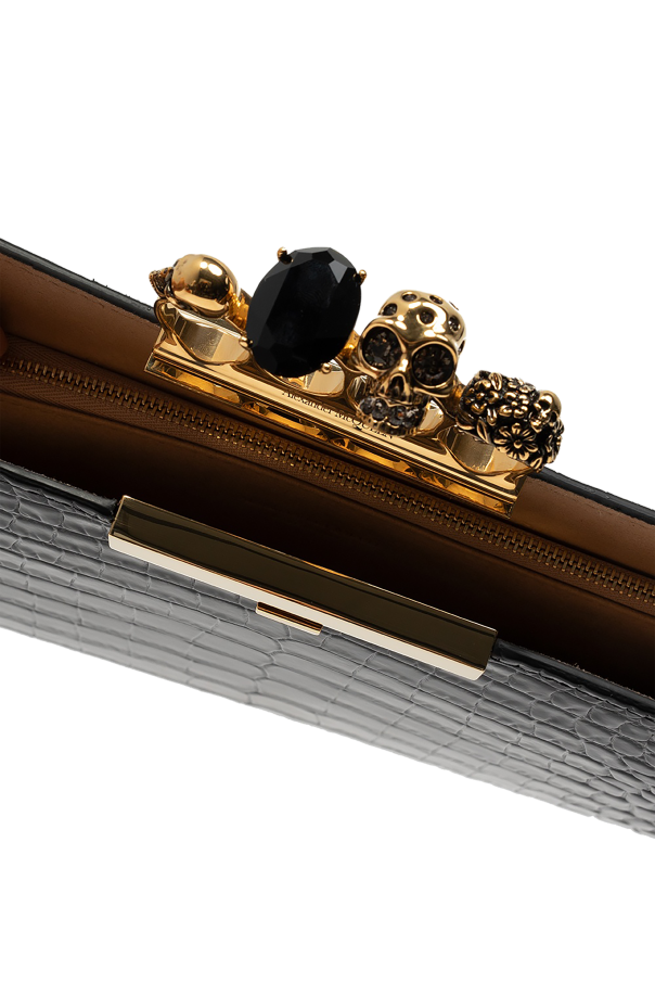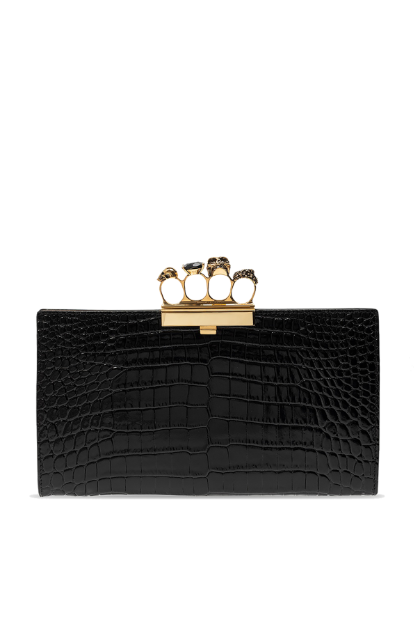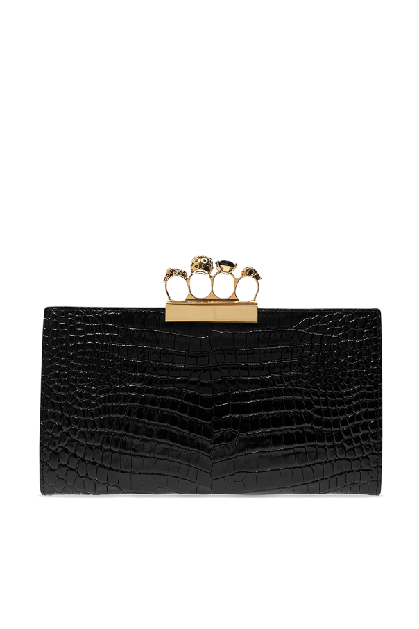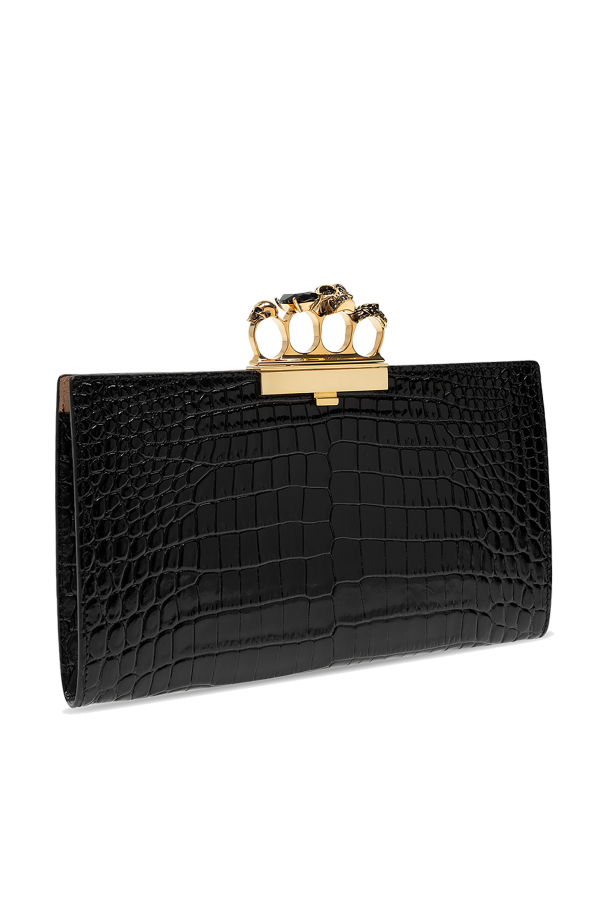 Black \'Four-Ring\' clutch from Alexander McQueen. Crafted from calf leather with a crocodile skin effect, this extravagant design is defined by its decorative handle consisting of four rings with the iconic skull embellished with Swarovski crystals in gold-tone-tone. It also features snap fastening, gold-tone brass hardware, beige suede lining and two zip pockets.