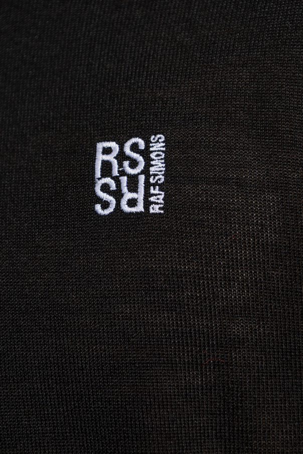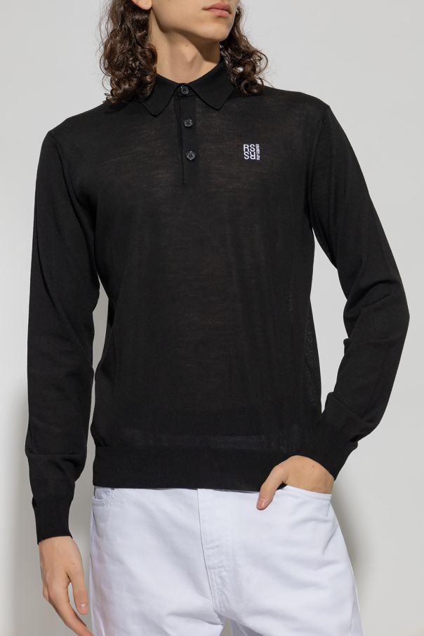 Black polo shirt from Raf Simons. Made of wool, this style features white logo embroidery, a button placket, long sleeves and elasticized trims on the collar, bottom hem and cuffs.