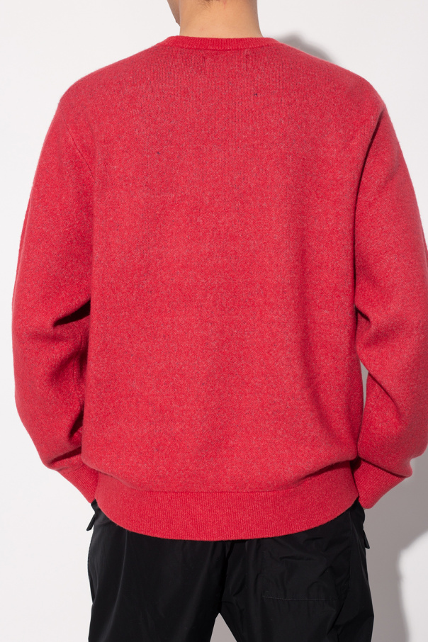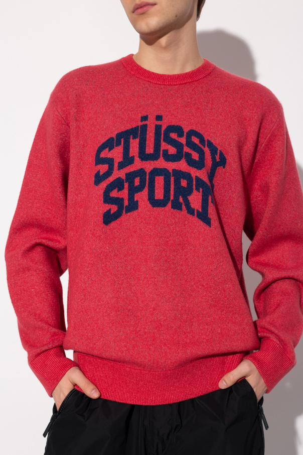 Red crewneck sweater from Stussy. Enriched by a navy blue graphic with the brand's logo, this style features a regular fit and ribbed trims on the collar, bottom hem and cuffs.