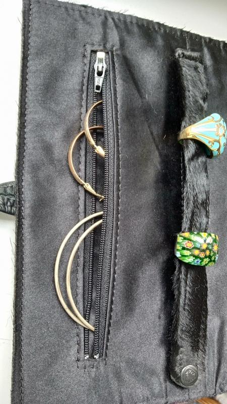 Дорожный органайзер для перемещения украшений в одном месте,в нем есть два отделения на молниях,два элемента на кнопках для каблуков и сережек.Р-ры.:24×14см.