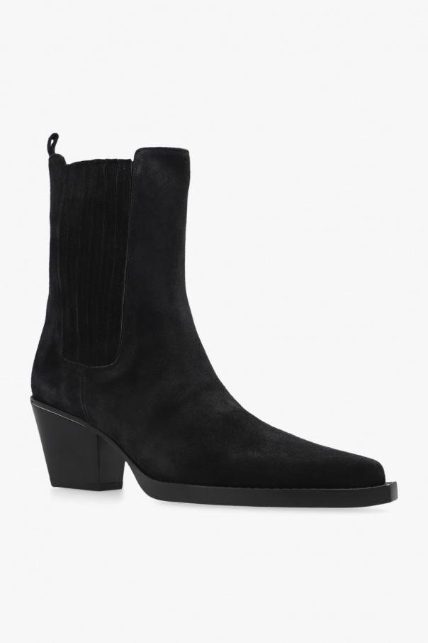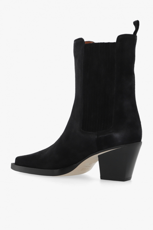 Black ‘Dallas’ heeled ankle boots from Paris Texas. Made of calf suede, this pair features elastic side panels, pointed toe and cream leather sole.