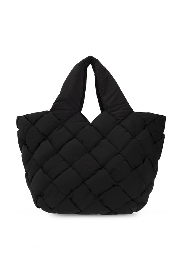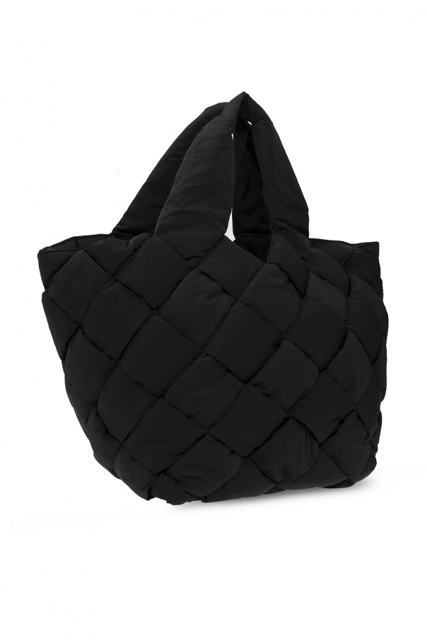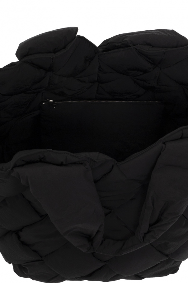 Black ‘Cassette Large’ shopper bag from Bottega Veneta. Crafted from padded technical material, this design showcases the brand\'s iconic Intreccio weave, two half-round handles, silver-tone metal hardware and an attached strapped zip pouch.