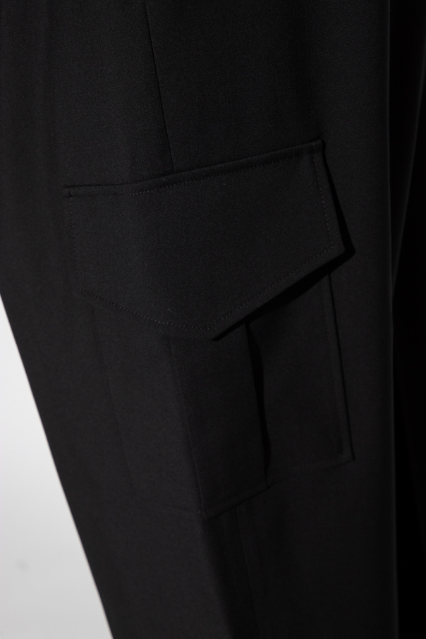 Black pleat-front trousers from Bottega Veneta. Made from wool, this pair falls with straight legs and features a zip fly with a button and hook, two slip pockets on the front and one flapped pocket with a triangular trim at the back.