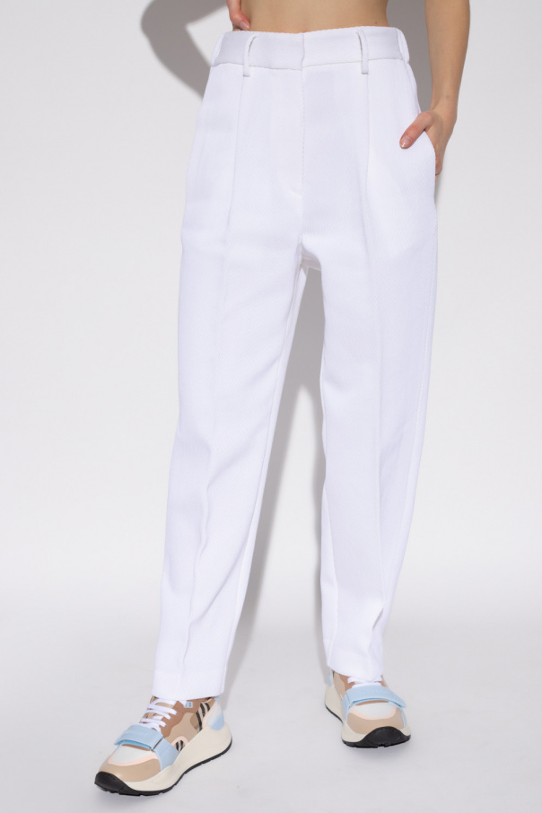 White pleat-front trousers from Forte Forte. Crafted from a cotton and wool blend with a ribbed structure, this pair features loose-fitting, slightly tapered legs, a zip fly with a button and a hook, an elasticated waistband and three slip pockets.
