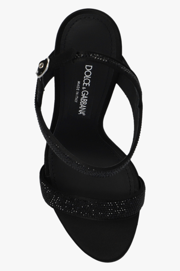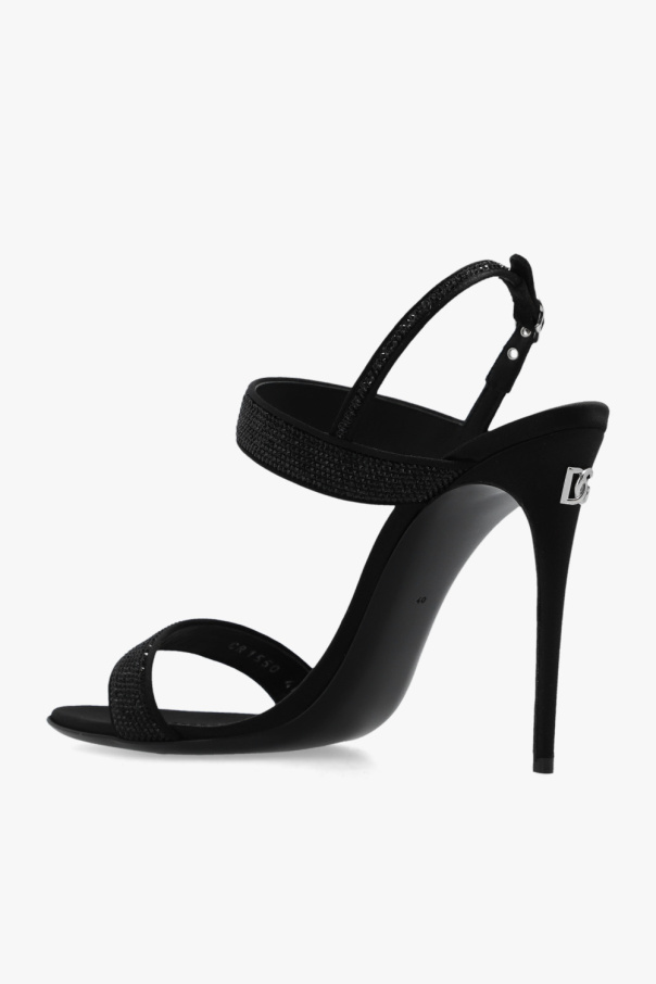 Black ‘Keira’ heeled sandals from Dolce & Gabbana x Kim. Made of leather, this pair features an adjustable buckled ankle strap, crystals, metal logo detail and leather sole in black.