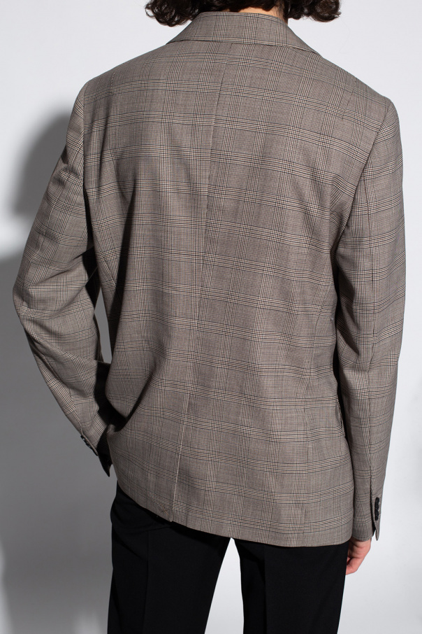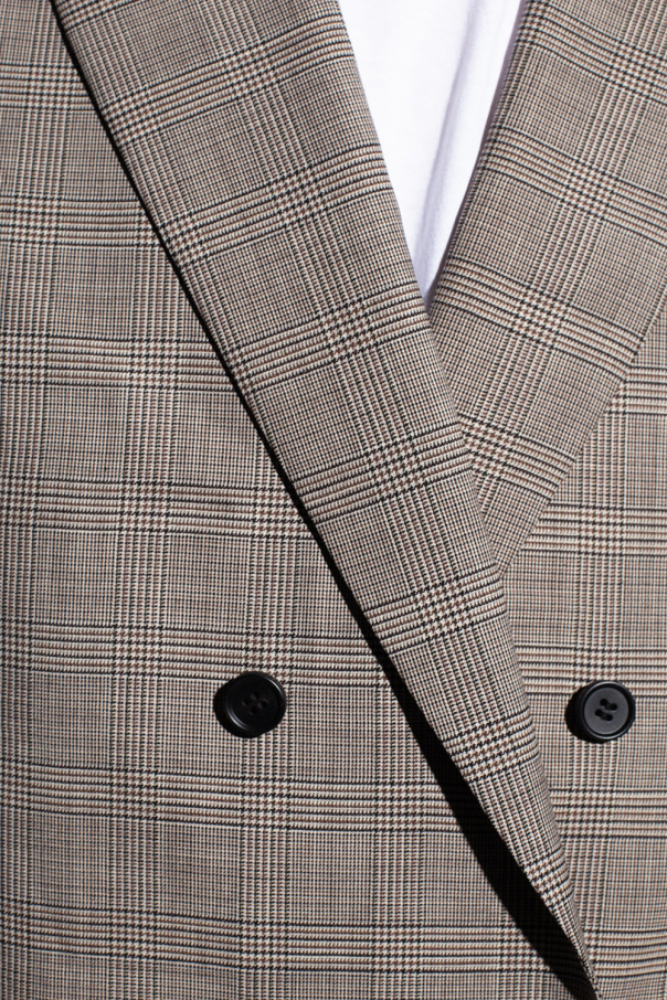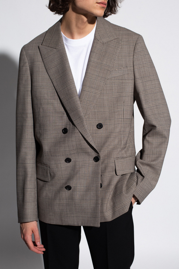 Cream, brown and black ‘Glebe’ double-breasted blazer from AllSaints. Embellished with a check pattern, this style features one welt pocket, two flapped pockets, peak lapels, long sleeves with button cuffs and a single vent at the back.