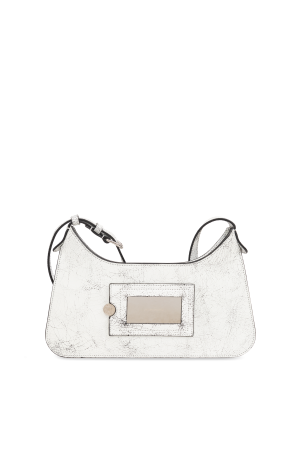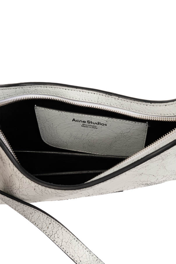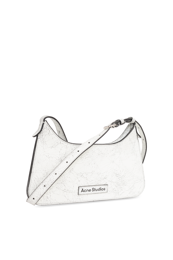 Introducing the quintessence of modern elegance and design - the Acne Studios Logo Shoulder Bag. Crafted from premium 100% cow leather with a distinctive cracked effect, this white shoulder bag epitomizes luxury and exclusivity. Its semi-circular silhouette, adorned with the unmistakable Acne Studios logo, sets a new standard for high-fashion accessories. The bag\'s single, adjustable shoulder strap offers versatile wearability, allowing for personal customization to one\'s desired length. A main compartment with a zippered inner pocket not only secures your essentials but also adds an element of functional sophistication. The front proudly displays a large designer logo, while a smaller metal plaque on the back subtly echoes the brand\'s identity. Silver metal hardware provides a striking contrast against the bag\'s white leather, enhancing its visual appeal. Reinforced edges and attention to detail underscore the bag\'s exceptional craftsmanship. Whether it serves as a statement piece or a complement to a refined ensemble, this Acne Studios shoulder bag is a testament to the brand\'s commitment to quality and distinctive design. Why Purchase This Product? Elegant, minimalist design with recognizable branding High-quality, 100% cow leather with unique cracked effect Functional with a main compartment and internal zippered pocket Adjustable shoulder strap for personalized fitting Striking contrast with silver metal hardware