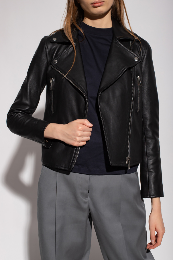 Black biker jacket from PS Paul Smith. Made of sheep leather, this garment features an asymmetrical closure, notch lapels, three zip pockets and long sleeves.