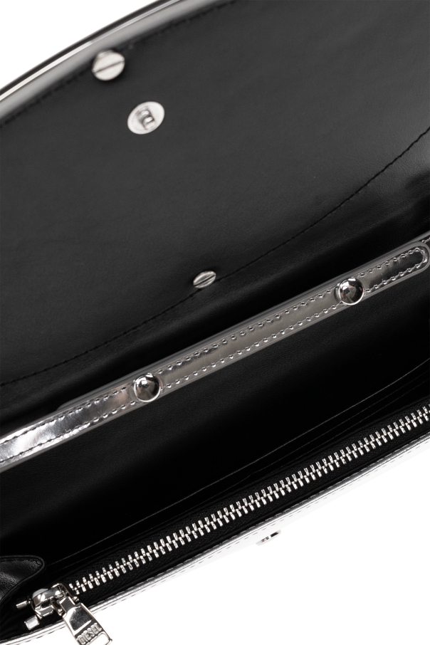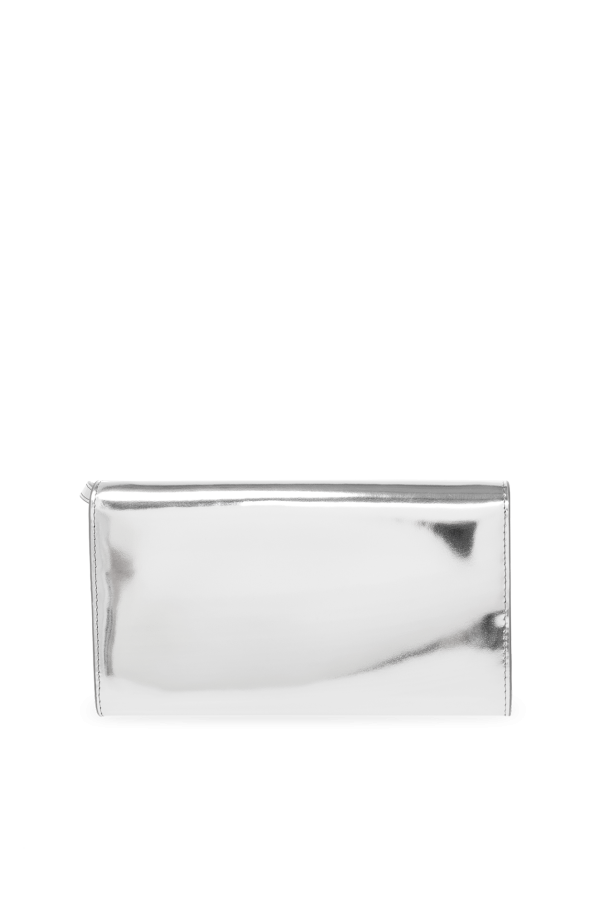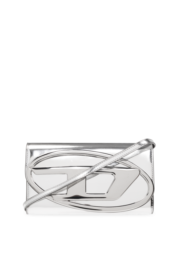 Silver-tone wallet from Diesel. Made of patent leather, this item fastens with a snap and is complete with a logo detail, adjustable strap and metal hardware in gold-tone. It has one internal compartment with one zip pocket, two slip pockets and four card slots.