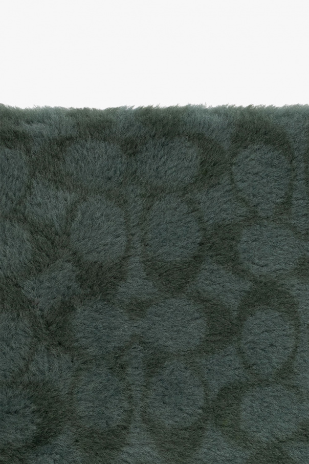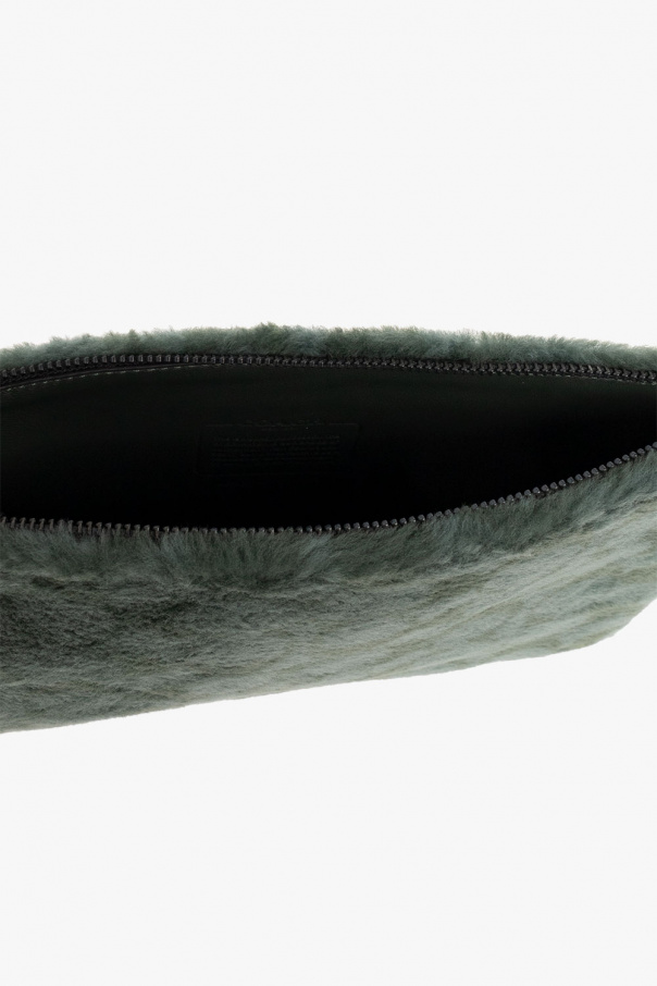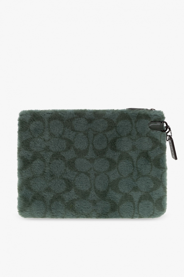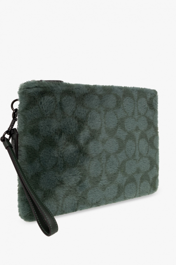 Green ‘Charter’ handbag from Coach. Crafted from sheep fur, this design fastens with a zipper and showcases a monogram pattern, a detachable wrist strap accompanied by a logo pendant on the side, dark silver-tone metal hardware and one internal compartment.