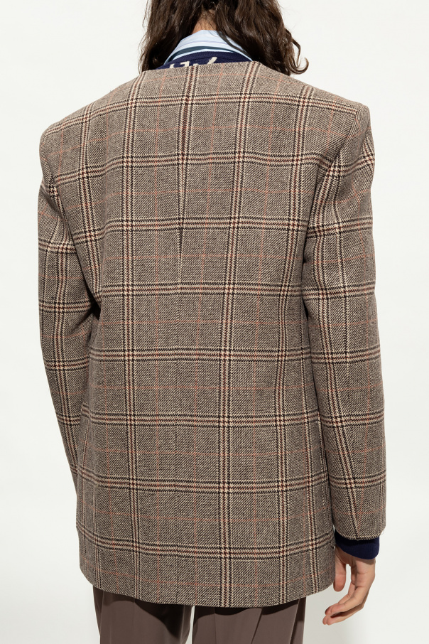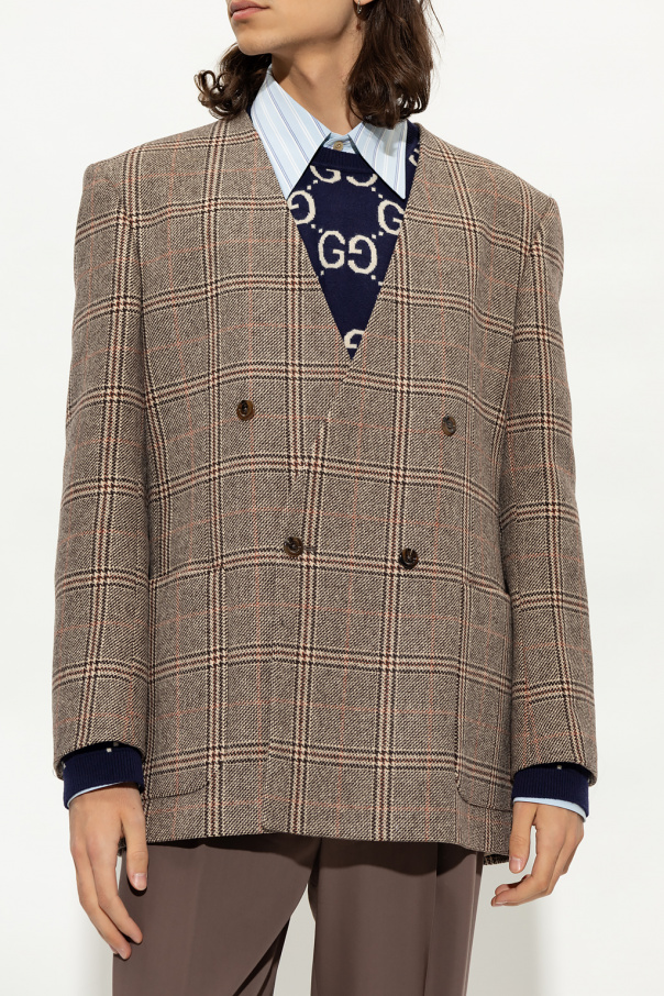 Beige and brown double-breasted blazer from Gucci. Crafted from wool, this long sleeve design features button fastenings, check pattern and two front pockets.