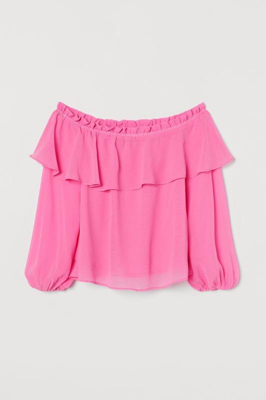 Блуза с открытыми плечами из воздушной ткани с эффектом жатости. Эластичность и широкий волан вверху, длинные, чуть более широкие рукава с резинкой на манжетах. Подкладка из джерси.S(36р)