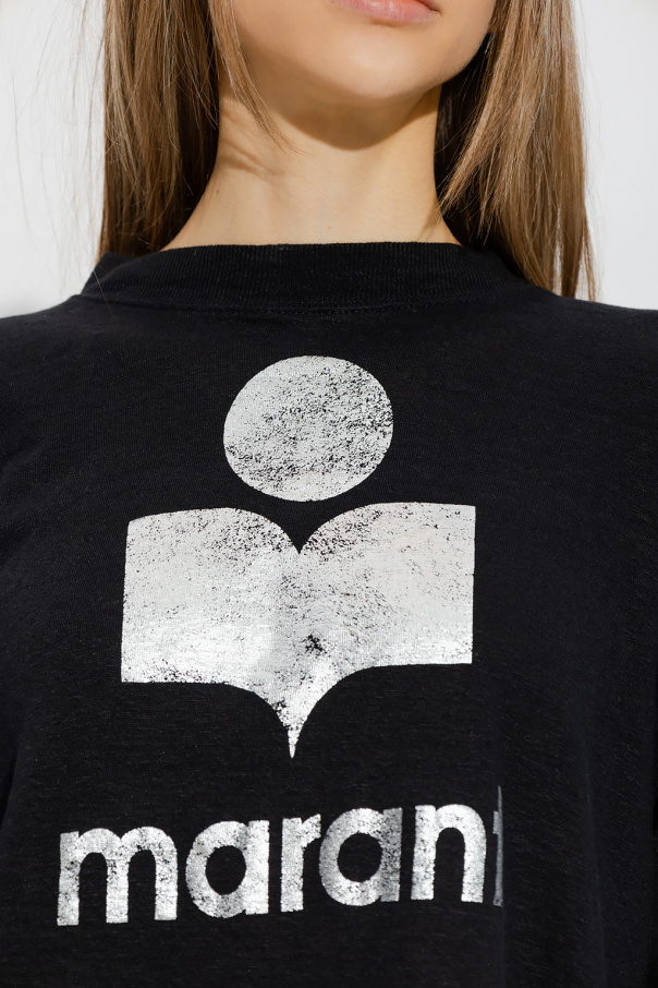 Black ‘Klowia’ crewneck sweatshirt from Isabel Marant Étoile. Made of linen, this long sleeve design features a printed logo pattern in silver-tone and ribbed edges.