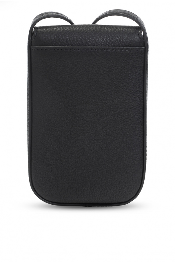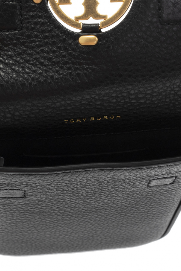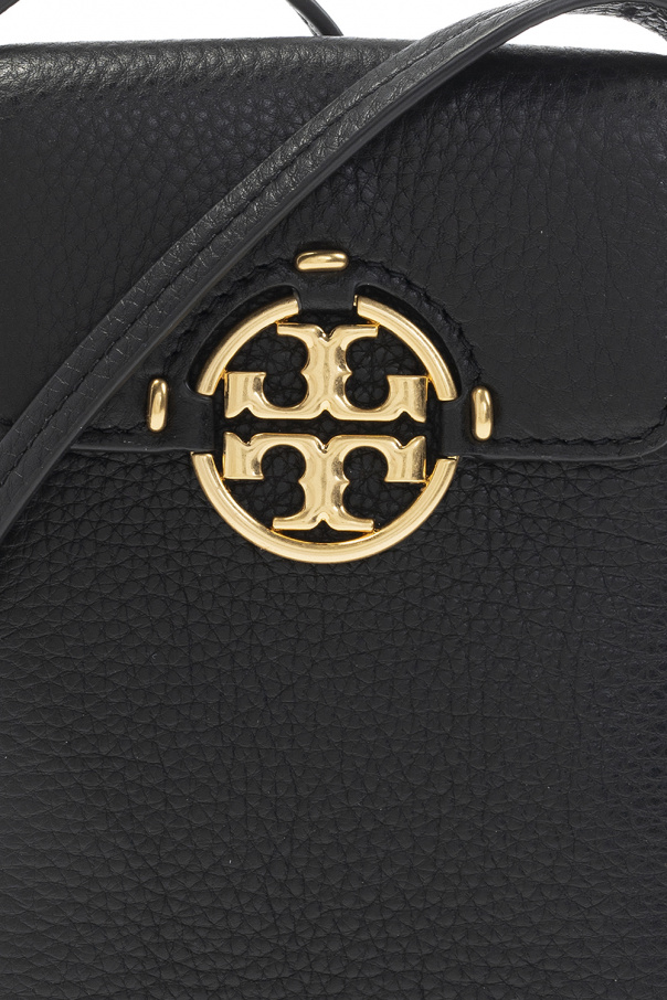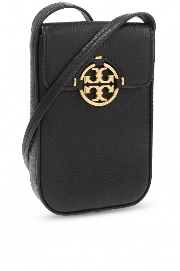 Black ‘Miller’ phone holder from Tory Burch. Made of leather, this model features a flap with a magnetic snap, metal logo detail, back pocket, adjustable shoulder strap, gold-tone metal hardware and one internal compartment with one card slot.