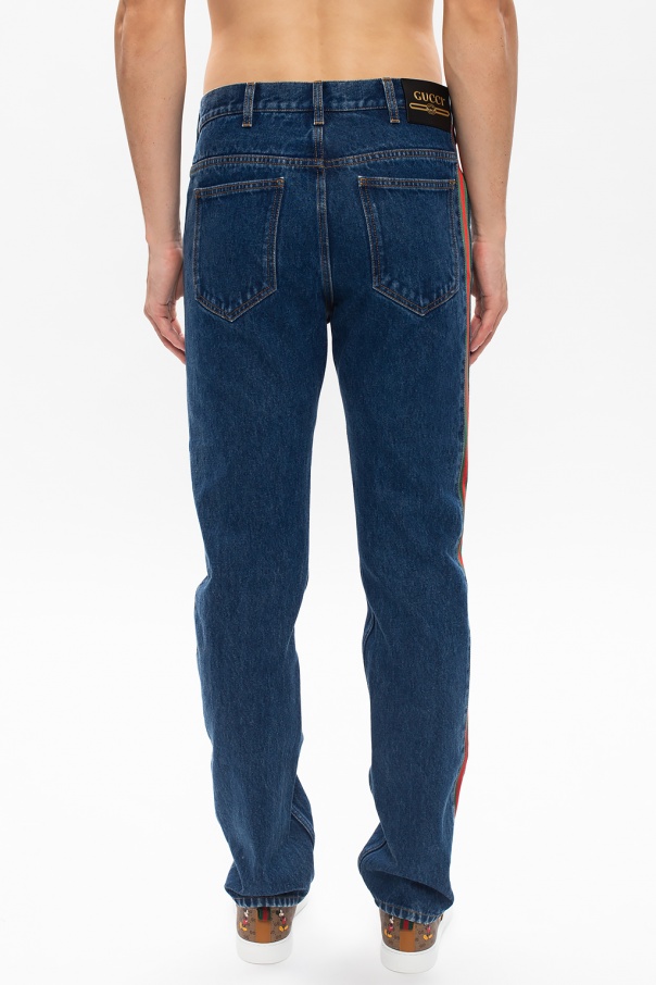 Dark blue jeans from Gucci. This pair falls down with straight legs and features button and zip fastenings, a red and green Web stripe, gold-tone and black logo patch and five slip pockets.