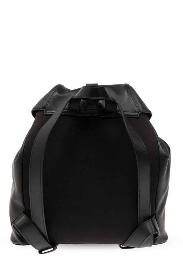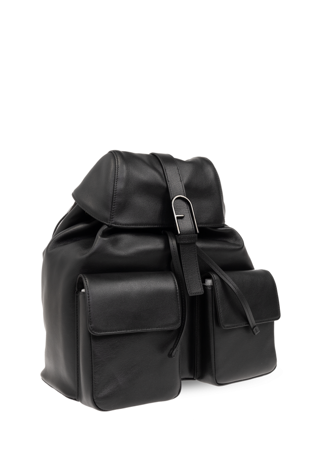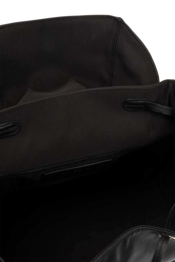 Black ‘Flow Large’ backpack from Furla. Made of leather, this design cinches closed with drawstrings and features a magnetic snap closure, a black, logo-shaped application on the front, one half-round handle, adjustable shoulder straps, gold-tone metal hardware and one internal compartment with one zip pocket and two slip pockets.